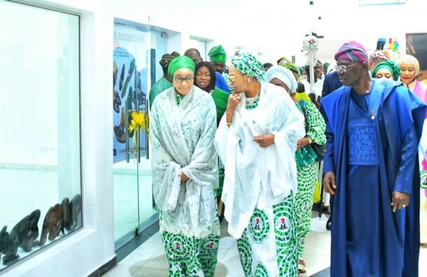 Wife of the Deputy Governor, Lagos State, Mrs. Oluremi Hamzat; wife of the Governor, Dr. Ibijoke Sanwo-Olu; Governor Babajide Sanwo-Olu; First Lady of Nigeria, Senator Oluremi Tinubu; wife of the Vice President, Hajia Nana Shettima and wife of Chief of Staff to the President, Mrs. Salamatu Gbajabiamila during the formal opening of Lagos State Leather Hub in Mushin, on Saturday, 23 August 2025.
