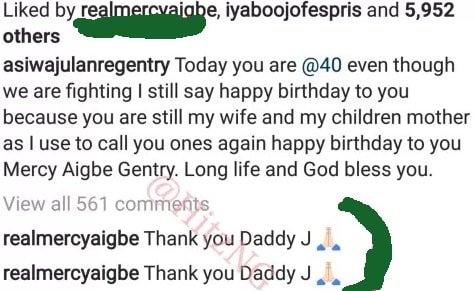 Surprisingly, Mercy went to Gentry’s Instagram handle, liked it and responded and wrote: