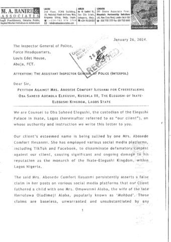 In a petition signed by the traditional ruler’s lawyers, M. A. Banire & Associates, a copy which was sighted, the king wants the police to move against one Abosede Comfort Ilesanmi a Nigerian based in Germany and Bukky Jesse who is resident in the United Kingdom, both of whom are using their tik tok accounts to embarrass the traditional ruler.