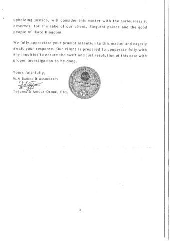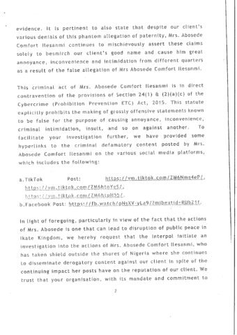 It further reads “It is pertinent to also state that despite our client’s various denials of this phantom allegation of paternity, Mrs.Abosede Comfort Itesanmi continues to mischievously assert these claims solely to besmirch our client’s good name and cause him great annoyance, inconvenience and intimidation from different quarters as a result of the false allegation of Mrs Abosede Comfort Ilesanmi.