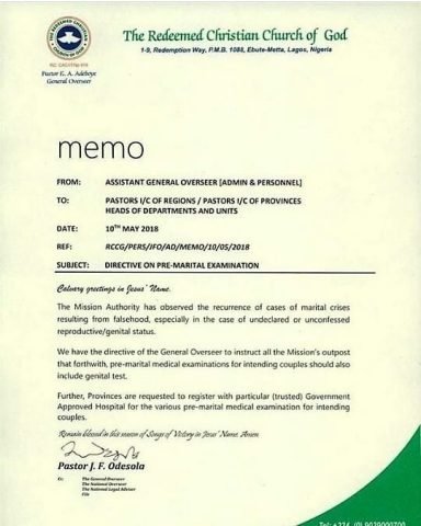 The Redeemed Christian Church of God (RCCG) has issued a directive compelling members intending to get married to subject themselves to what it called: “genital test.”
