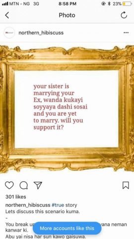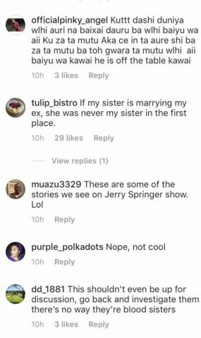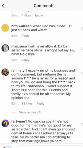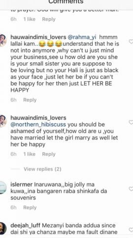 Apparently, Rahmayi was answering an innocuous question posed by a northern-based blogger, “Northern Hibiscus” on Instagram: ”YOUR SISTER IS MARRYING YOUR EX AND YOU ARE YET TO MARRY. WILL YOU SUPPORT IT?